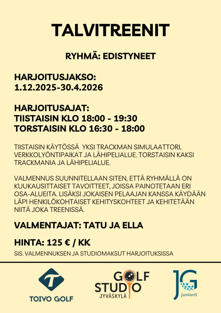 Harjoitukset pidetään Golf Studio Jyväskylän tiloissa Kirrissä.
