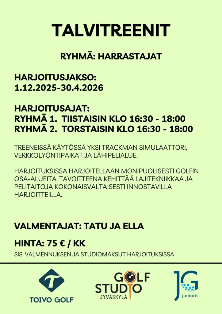 Harjoitukset pidetään Golf Studio Jyväskylän tiloissa Kirrissä.